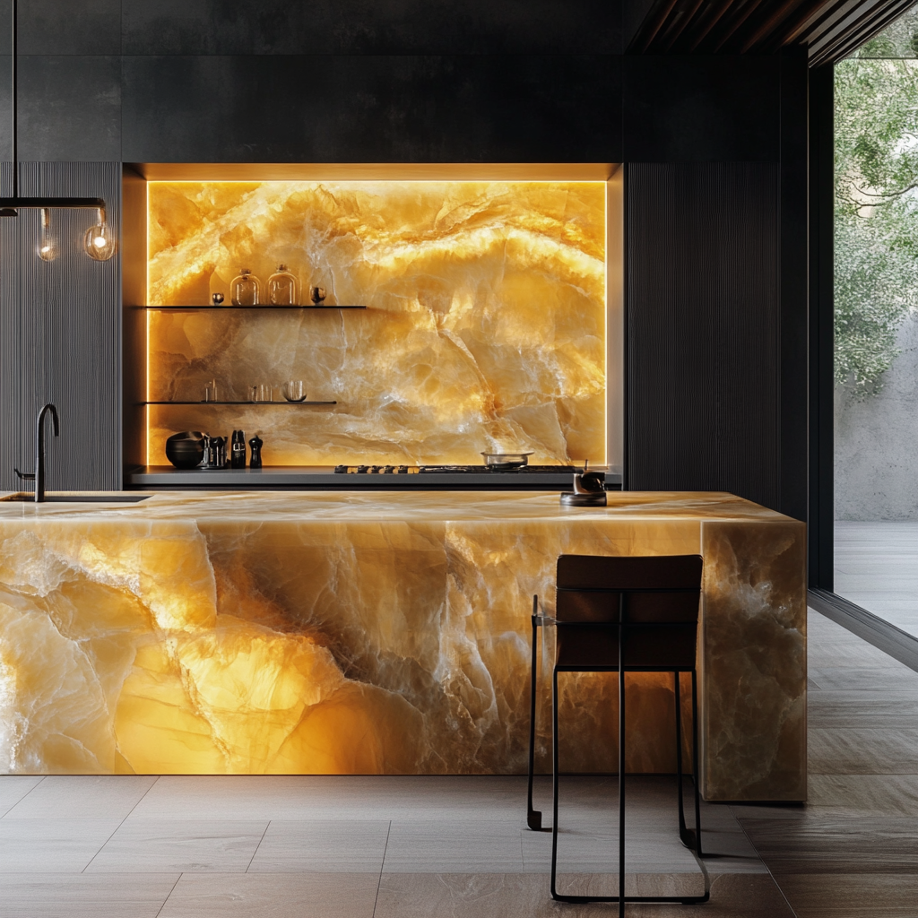 Tra le pietre naturali più scenografiche utilizzate per la retroilluminazione, l’onice occupa un posto d’onore. Con la sua accentuata traslucenza, che in alcuni casi sfiora la trasparenza, e le sue venature sgargianti e cromie intense, l’onice è ideale per creare superfici decorative di grande impatto: piani di lavoro, rivestimenti, pareti sceniche e oggetti di design.