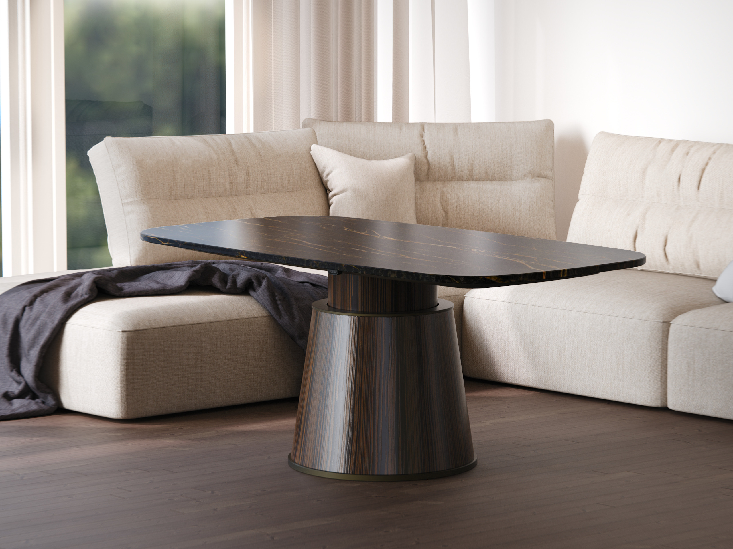 La magia di questo moderno tavolo in granito e legno risiede nella sua tecnologia di regolazione in altezza.