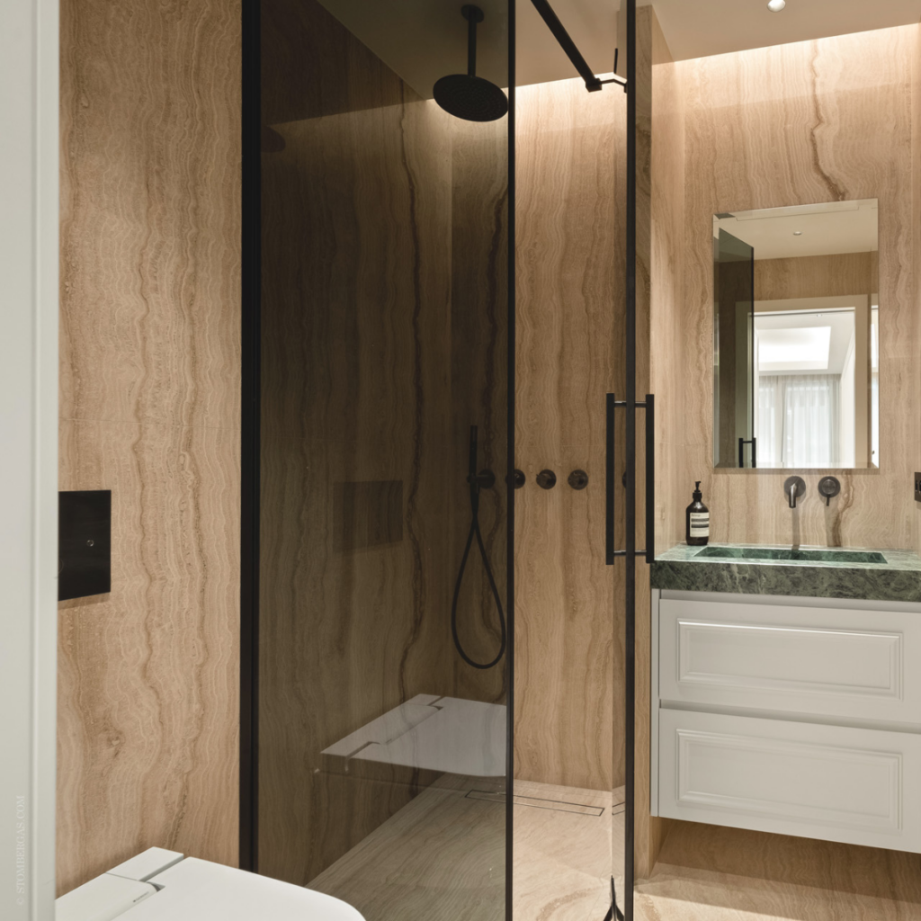 The bathroom of this luxury apartment is a perfect example of timeless elegance, thanks to the use of Travertino Striato, a natural stone characterized by light and warm colors, crossed by refined longitudinal striations. This material was chosen to create an environment of great visual impact and at the same time highly functional, with tailor-made solutions that enhance its beauty and versatility.